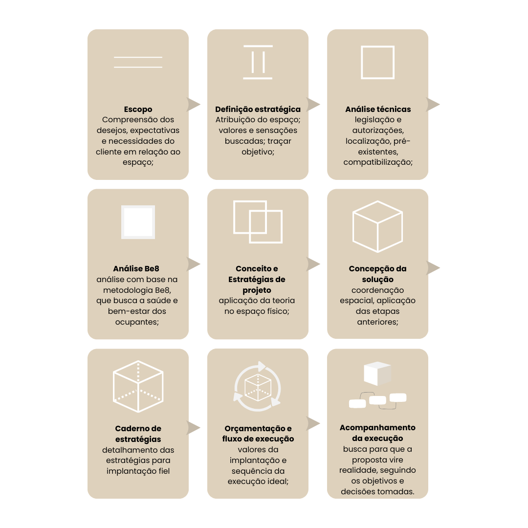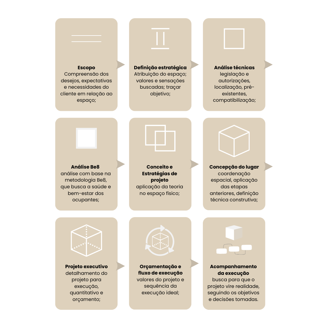 Projetamos com foco em promover o bem-estar e a saúde das pessoas, otimizando seu desempenho e resultando em soluções que realmente fazem a diferença. Os projetos são desenvolvidos conforme a metodologia a seguir:
